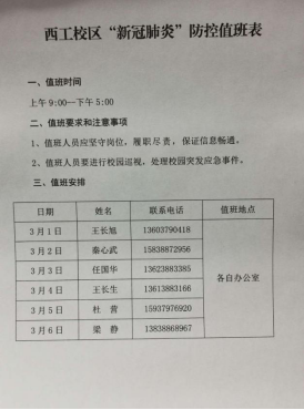 针对西工校区的实际情况,大家一致认为要在开展网络教学的同时做好春季开学的前期准备工作。会议研究制定了西工校区学生春季开学工作方案,并安排了近期“新冠肺炎”防控值班。