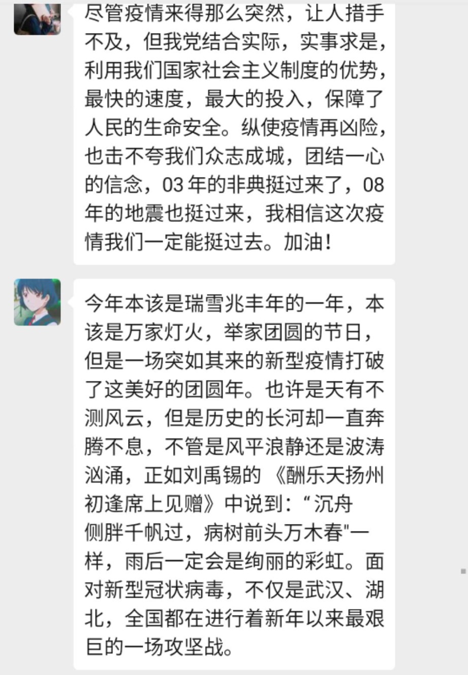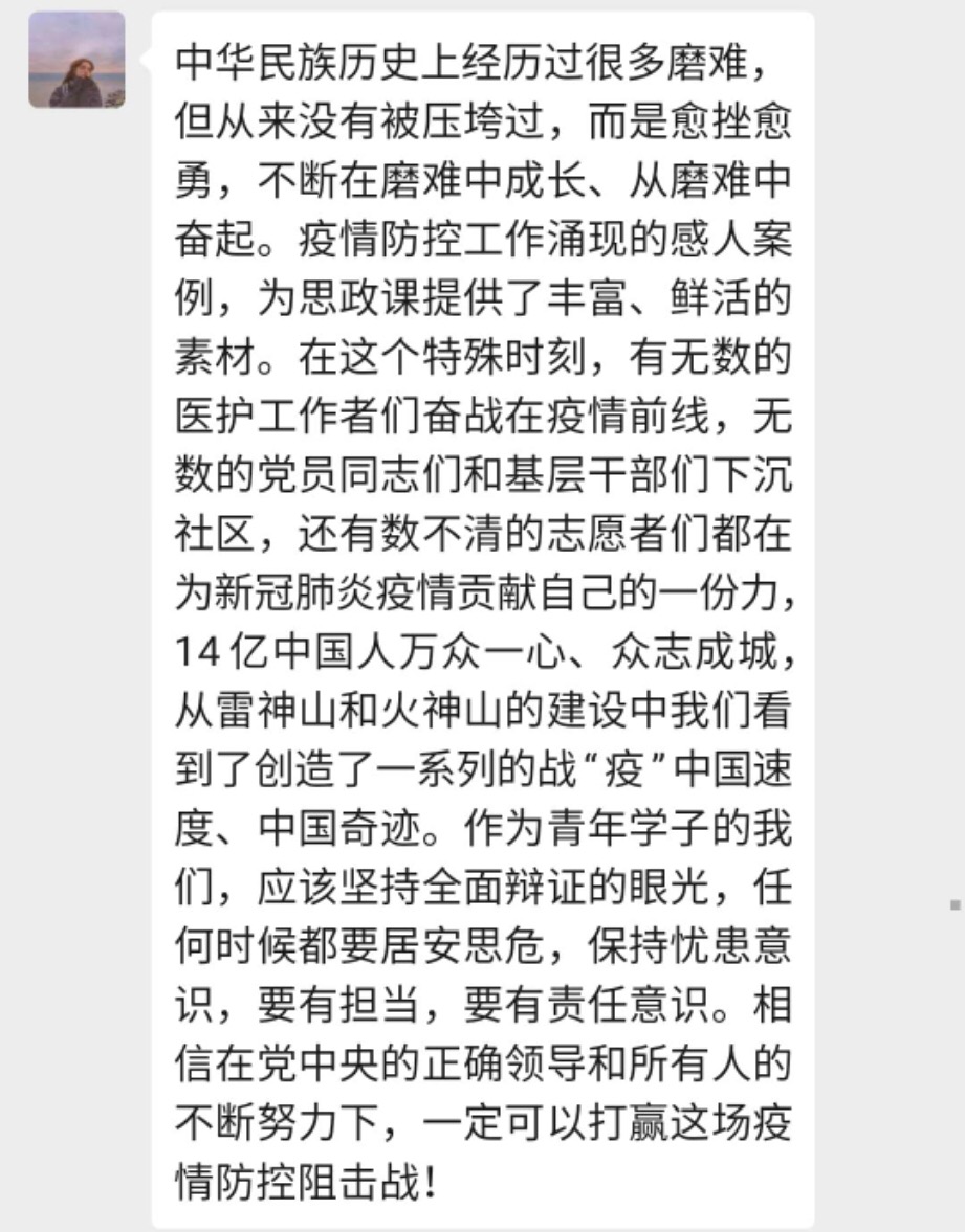 通过四位高校马克思主义学院的资深教授结合四门必修课,对于疫情防控深入浅出的解读,师生纷纷表示受益匪浅,深刻的感到了少年兴则国兴,少年强则国强。奋斗是青春最靓丽的底色,我们定会在这场战“疫”中贡献自己青春力量,坚定党和国家的领导,争做有理想、有本领、有担当的时代新人。