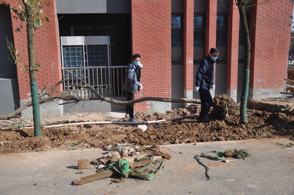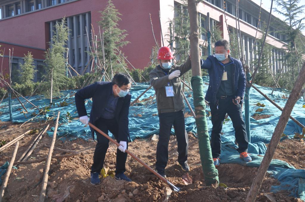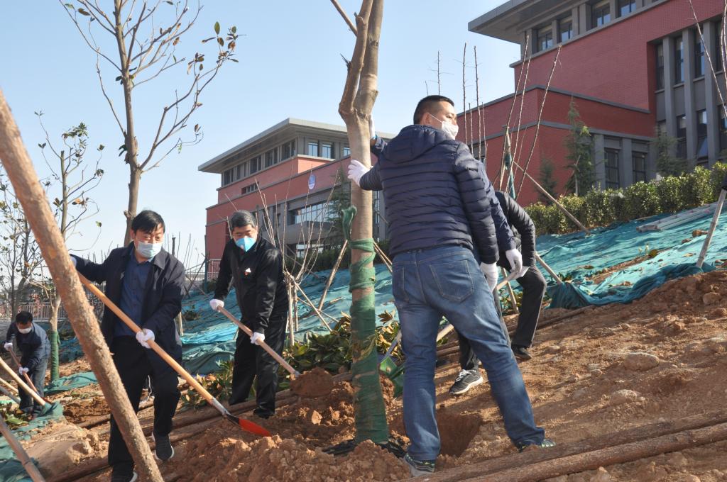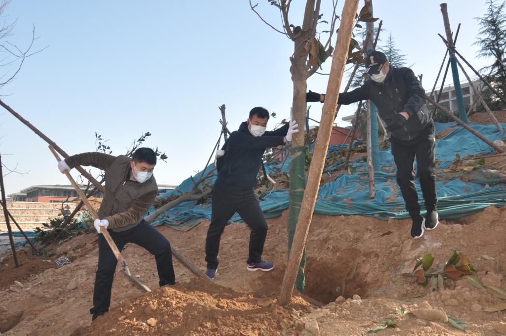植树现场,浓浓春意,呈现出一片忙碌景象,所有党员干部佩戴口罩,相对分散植树,切实做到人员不扎堆、不聚集。大家挥锹铲土、扶直苗木、培实新土、提桶浇水,三两人通力合作,认真地完成着每一道工序,合力种下百余棵四季青、大叶女贞等苗木。在植树间隙,大家还清理了杂物,堆放到指定地点。在大家的努力下,一株株新绿昂然挺立,一颗颗新树苗扎根新校区,迎风舒展,在和煦的春风中焕发出勃勃生机。