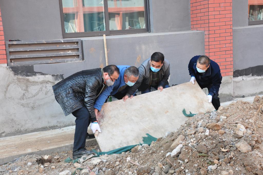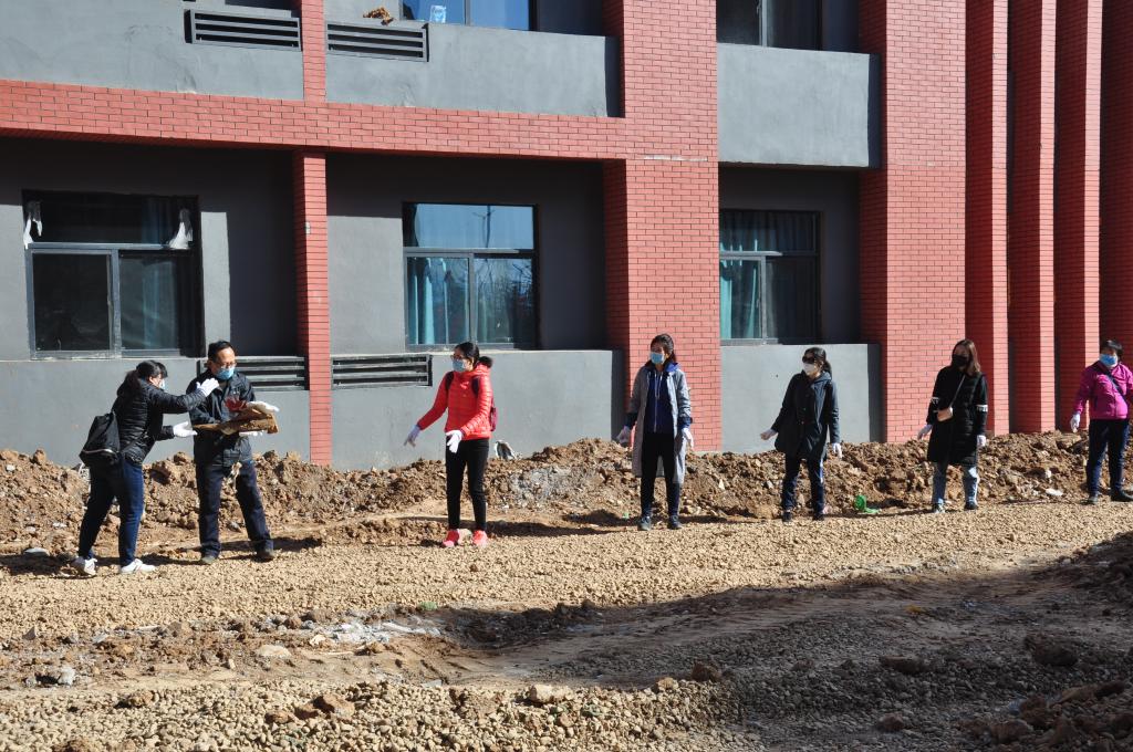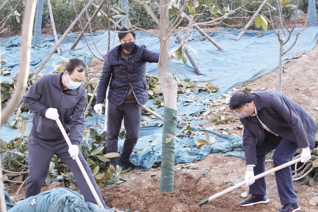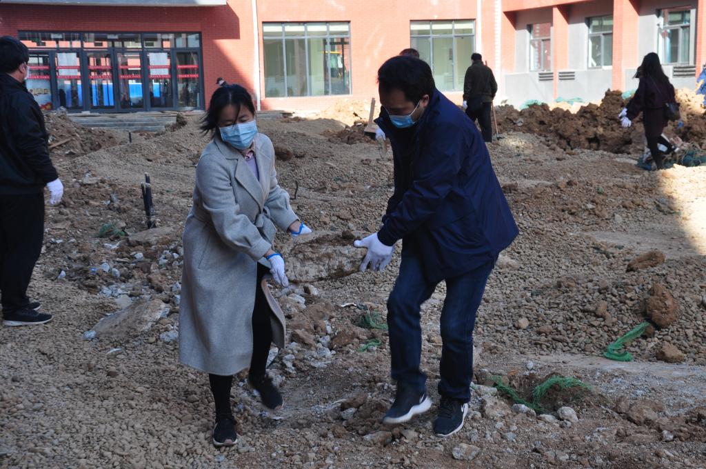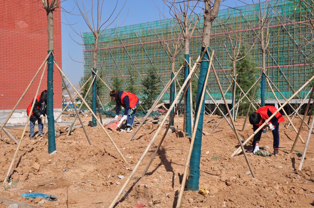 植树现场,浓浓春意,呈现出一片忙碌景象,所有党员干部佩戴口罩,相对分散植树,切实做到人员不扎堆、不聚集。大家挥锹铲土、扶直苗木、培实新土、提桶浇水,三两人通力合作,认真地完成着每一道工序,合力种下百余棵四季青、大叶女贞等苗木。在植树间隙,大家还清理了杂物,堆放到指定地点。在大家的努力下,一株株新绿昂然挺立,一颗颗新树苗扎根新校区,迎风舒展,在和煦的春风中焕发出勃勃生机。