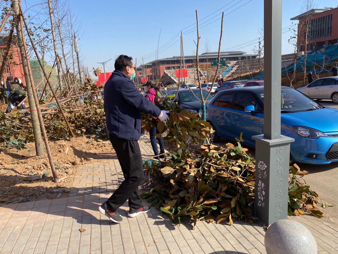 煦暖的阳光照耀,和柔的东风吹拂。同志们在这空气清新、心旷神怡的春色里,忙的不亦乐乎。处处是忙碌的身影,大家铲土培实、栽树扶植,三人成组、五人成团,每道工序都认真细致、一丝不苟。