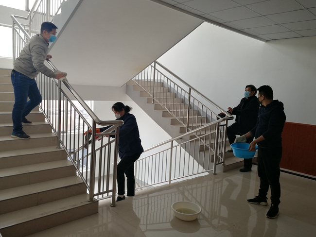 会后全体党员志愿开展对办公楼楼梯扶手、走廊等公共卫生的消毒打扫活动。充分彰显党员先锋模范作用,让党旗在疫情防期间高高飘扬。