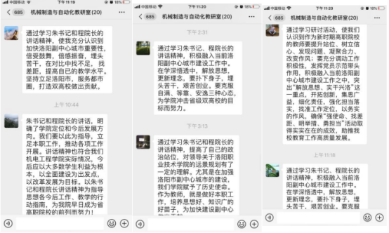 机电工程学院机械教研室主任王俊卿组织全体成员进行微信线上自学并讨论,强调教研室各位老师要认清不足,找到差距,立足本职工作,提高教学科研水平,为服务洛阳区域经济发展,打造双高院校做出应有贡献,教研室成员学习后倍受鼓舞,纷纷在微信群中发表讨论感想。