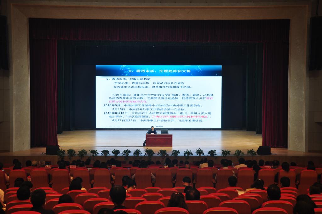 河南省委十九大精神宣讲团成员、《习近平谈治国理政》第三卷宣讲专家、郑州大学马克思主义学院教授于向东应邀来校,作《习近平世界局势观与国际格局的百年演变》专题报告。于向东从如何学好用好《习近平谈治国理政》第三卷、习近平世界局势观的丰富内涵、世界格局的演变与大国兴衰、中美关系70年及发展走势、维护世界和平发展时代主题面临的严峻挑战五个方面,深入阐述了党的创新理论的精髓要义,深刻剖析了世界格局演变的现状和原因。整场讲座持续两个多小时,高屋建瓴,深入浅出,为我校党员干部学深悟透党的创新理论提供了有力指导。