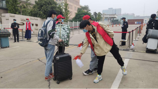 学校门口新生们接踵而至,学长志愿者们为他们进行消毒,之后热情的为新生搬运行李,协助新生办理报到手续,给新生指引道路并介绍校园环境。迎新的同学认真的为新生办理每一项入学手续,并为她们提供各种咨询,解答家长提出的种种问题,直到他们脸上露出会心的笑容。还有我们十分辛苦的志愿者穿梭于迎新现场,时刻等待着为新同学伸出援手,帮他们提行李,给他们带路。