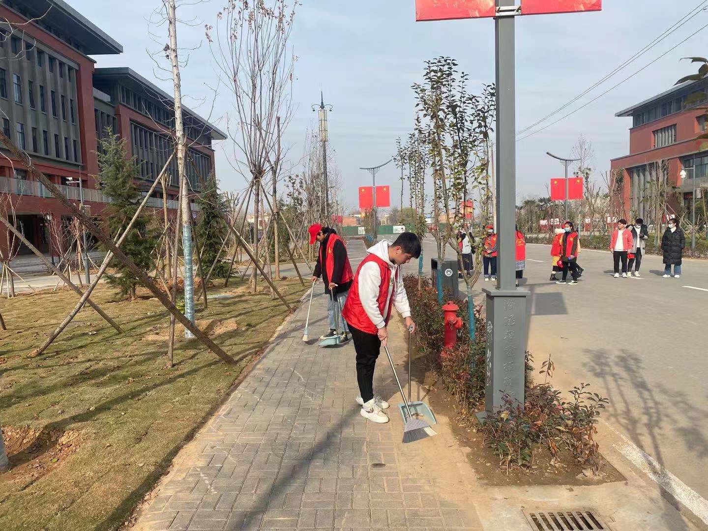 志愿者们身穿红马甲,佩戴志愿者服务标识,带着铁锹、扫帚、簸箕等工具,分成两队,将校园里的纸屑、落叶、杂草进行集中清扫。经过一个多小时的努力,校园变得干净整洁。