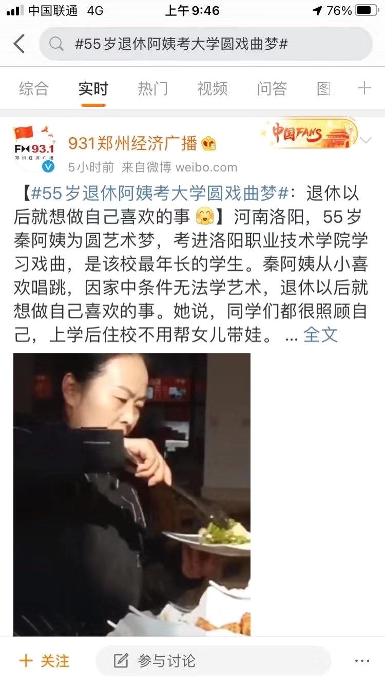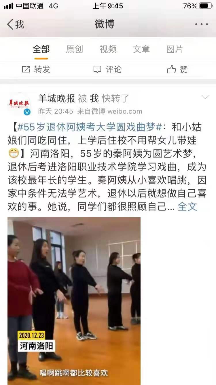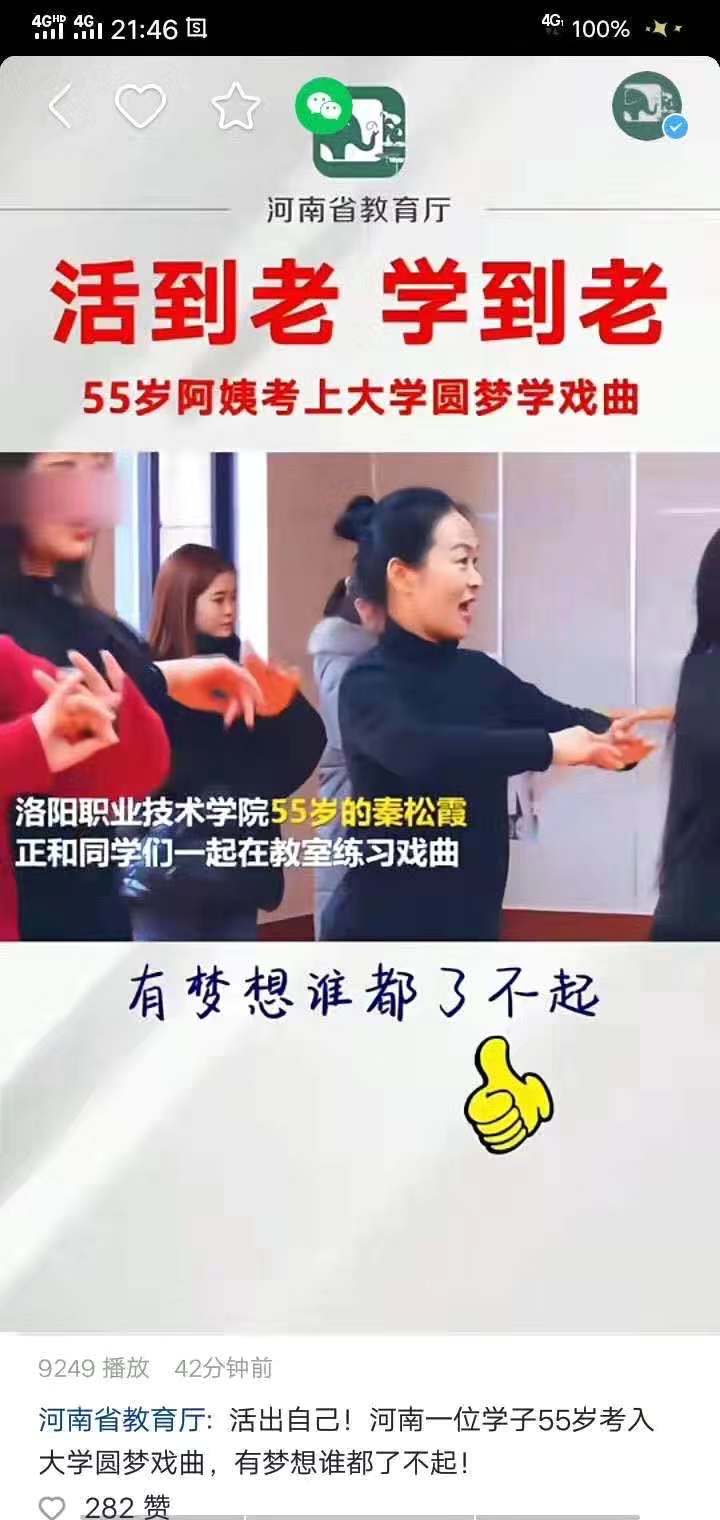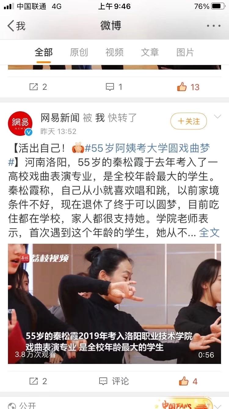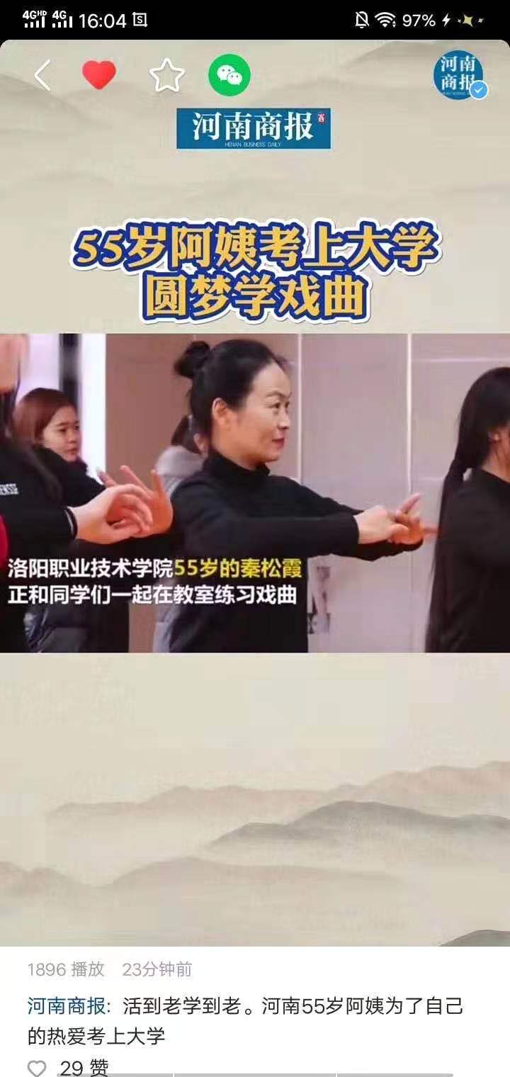 河南日报客户端、河南省教育厅、澎湃新闻、中国新闻网、洛阳晚报、梨视频、荔枝新闻、网易新闻、河南商报快手号、洛阳网、时间视频等媒体报道我校戏曲艺术学院55岁大龄女生秦松霞的故事。相关报道截图如下: