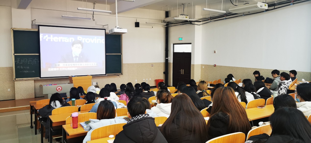 活动中,辅导员带领学生重温了去年2月郑邦山厅长在河南省疫情防控第九场新闻发布会上的讲话,回顾了疫情爆发一年以来各行各业走过的艰辛历程。