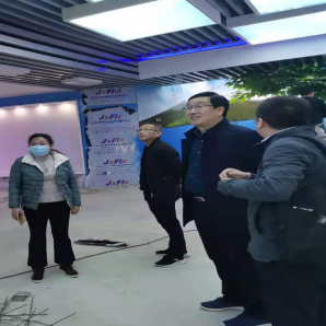 在正在施工中的南馆和北馆,张彦芳向程相朝讲解了南、北馆的施工流程和进度计划,程相朝和展馆的设计、施工人员进行交谈,对整个展馆的施工过程和施工进度表示赞许。