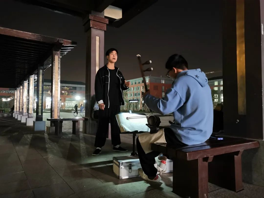 夜幕来临,洛阳职业技术学院戏曲艺术学院师生来此练习《牡丹亭》。