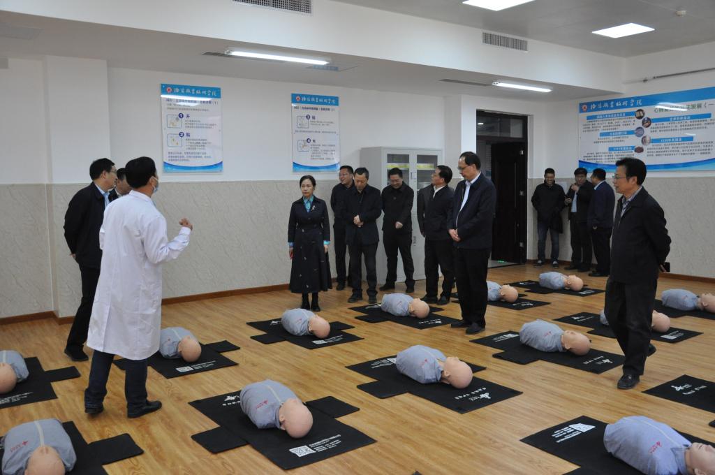 在护理学院急救实训中心,调研组依次参观了急救医学仿真训练室、院外心肺复苏训练室、院内急救综合训练室、院前包扎固定训练室、院前急救训练室,对我校护理学院实训设施表示肯定。
