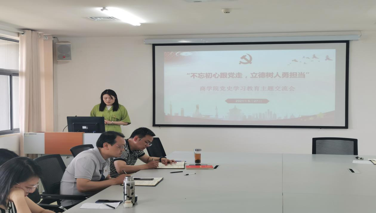 5月27日下午,商学院组织全体教职工在大学生活动中心四楼会议室开展以“不忘初心跟党走,立德树人勇担当”为主题的党史学习教育交流活动,交流活动由商学院党总支副书记马选宝主持。