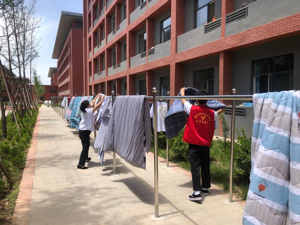 夏季风大雨多,宿舍管理员每日定时巡视晾晒场区域,帮助学生拾起晾晒场掉落的衣物,雨天帮助学生收回晾晒的衣物。