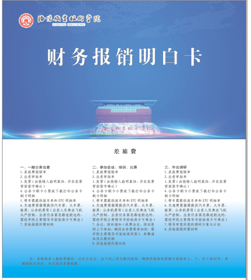 优化服务环境,推行一次性告知。针对日常报账频率较高的差旅费、货物或服务采购等业务,制作了财务报销“一次性告知”明白卡。明白卡中明确了差旅费、货物或服务采购类业务所需的报销资料,为广大师生提供了便捷的财务办事环境,避免基层职工二次往返,努力推行优质服务。