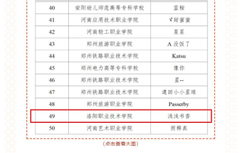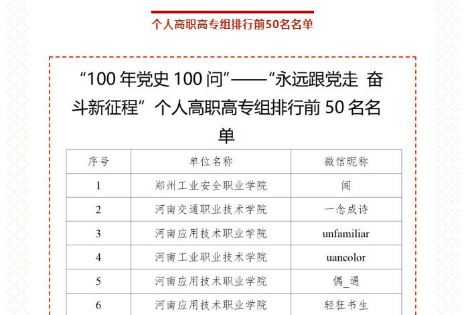 近日,河南省教育厅公布党史学习教育“100年党史100问”——“永远跟党走 奋斗新征程”百年党史知识竞赛结果,我校全校师生踊跃参与,积极答题,经过10天的激烈角逐,最终获得高职高专组一等奖。