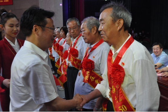 党委书记朱美荣为“光荣在党50年”老党员代表朱素玲等10名老同志颁发纪念章。他代表学院党委向去年以来在“双高校”建设和疫情防控等各项工作中辛勤付出的全体党员致以诚挚的节日问候,向获得“光荣在党50年”纪念章的老党员致以崇高的敬意,向受到表彰先进集体和优秀个人表示热烈祝贺。
