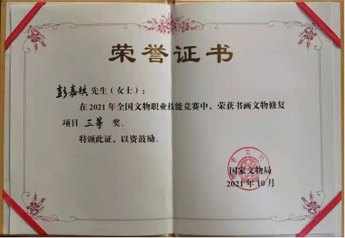 本次竞赛共分为古建筑木作、古建筑瓦作、古建筑彩画作、瓷器文物修复、书画文物修复、考古勘探6个项目,每个项目均设置理论考核和实际操作两个环节,我校文物保护考古学院选派3名学生分别参加瓷器文物修复、书画文物修复、考古勘探3个项目的竞赛,经过一天半的紧张比赛和评比,2019级大专文物修复与保护专业301班学生彭嘉祺荣获书画修复组三等奖,这也是继2018年以来,我校学生第二次在全国文物职业技能竞赛中获奖,与2018年相比,本次竞赛规模更大、参赛选手更多、各界关注度更高。彭佳琪是来自全国19个省份152名参赛选手中年龄最小、唯一以在校生身份获奖的选手。