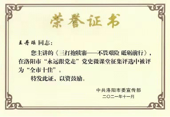 日前,洛阳市委宣传部举办的“永远跟党走”党史微课堂作品征集评选活动结果揭晓,我校老师孙小利、王丹瑶的党史微课堂作品获“全市十佳”。