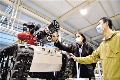 在中信重工高端装备制造产业园的特种机器人制造智能化工厂,一个个最新下线的消防机器人引起了青年代表的浓厚兴趣。