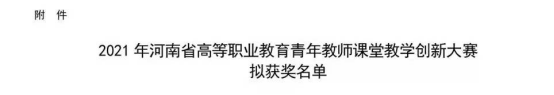 12月13日至12月16日,由河南省教育厅主办的2021年河南省高等职业教育青年教师课堂教学创新大赛圆满落幕。来自全省26所高职院校的32支青年教师参赛队参加公共基础课程组现场决赛。