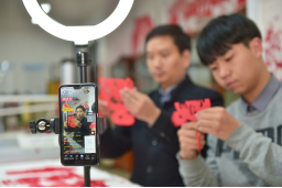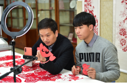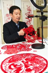 省级非遗项目剪纸技艺代表性传承人王飞与基地学员正在直播间,通过“云端”秀起了传统剪纸技艺。