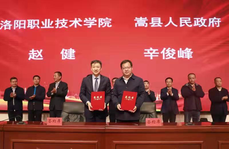 签约仪式上,洛阳职业技术学院院长赵健代表学校分别与涧西区、洛龙区、伊滨经开区、嵩县签订校地合作产教融合协议。