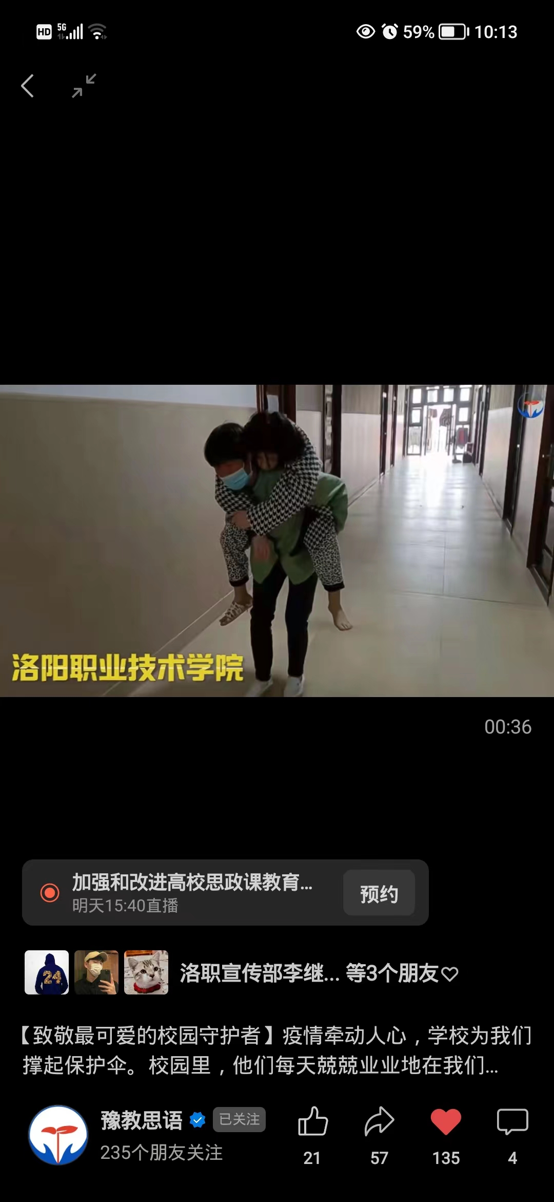 2022年4月3日,豫教思语官方视频号发布【致敬最可爱的校园守护者】。有我校校园工作者视频。原视频如下: