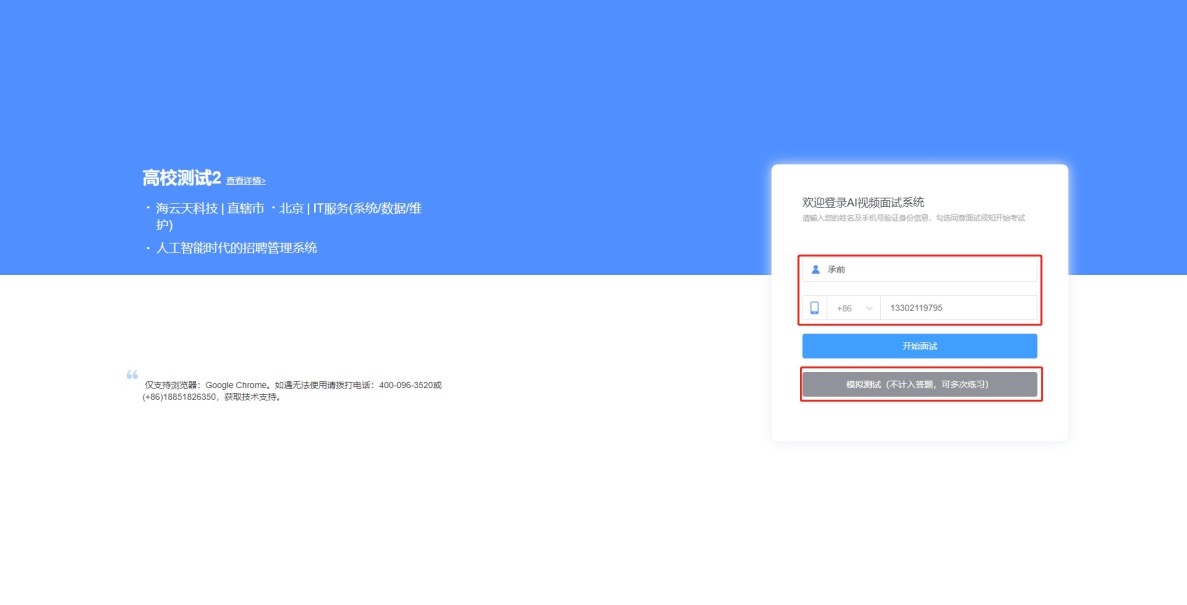 输⼊⾃⼰的姓名、⼿机号(需与之前提供的信息保持⼀致),点击模拟测试,进⾏设备检测。