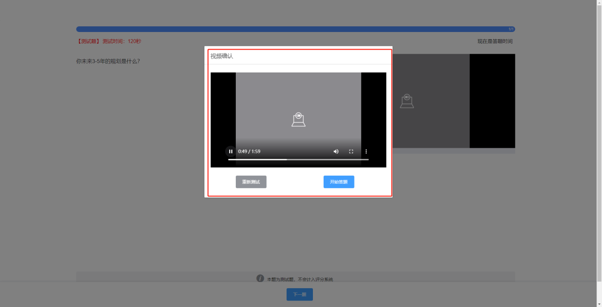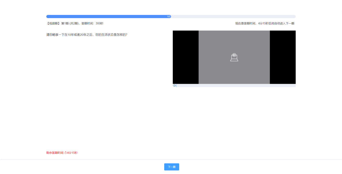 作答完成后点击下⼀题请中着重检查视频当中声⾳⾳量是否合适,可根据实际情况进⾏重新作答,或点击开始答题。