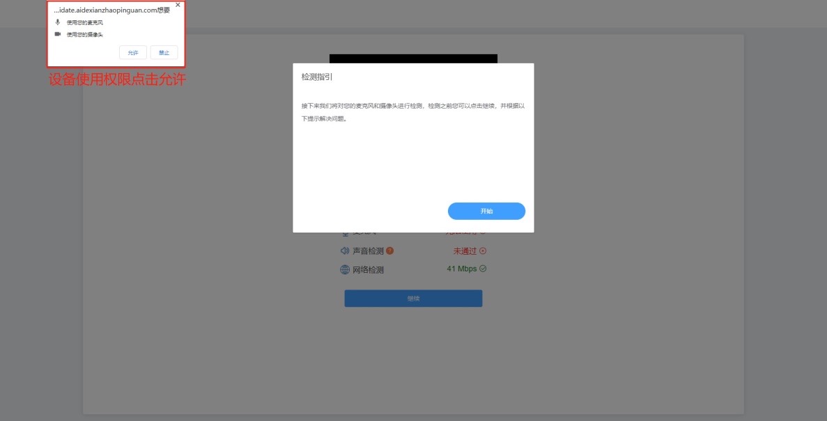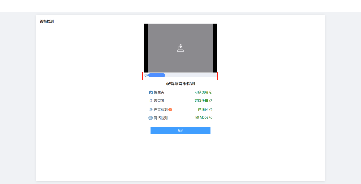 声⾳检测需要考⽣对着⻨克⻛说话检测⾳量条(下图所示)是否变化,四项检测通过后点击继续即可开始测试。