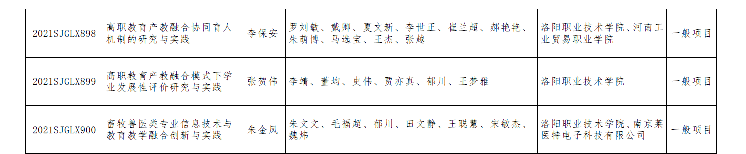 近日,河南省教育厅公布了2021 年度河南省高等教育教学改革研究与实践立项项目(教高〔2022〕138号),我校李保安教授主持的《高职教育产教融合协同育人机制的研究与实践》、朱金凤教授主持的《畜牧兽医类专业信息技术与教育教学融合创新与实践》以及张贺伟副教授主持的《高职教育产教融合模式下学业发展性评价研究与实践》3个项目被认定为河南省教学改革与实践一般项目。