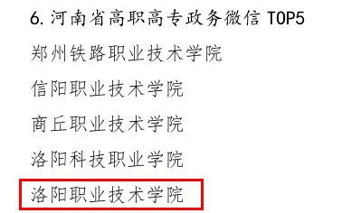 我校官方微信账号开通于2020年11月,2021年度共发稿274篇,先后8次在河南省教育系统官方排名前十名,多次上榜河南省教育系统“两微”综合传播力排行榜高职高专微信排行榜的前十名,在《河南省教育系统2021年度新媒体白皮书》高职高专政务微信排行榜中排名第五。