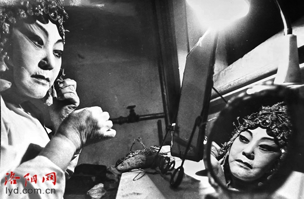 1997年9月,马金凤赴澳门演出前,率原市豫剧一团在洛阳剧院连演4场,演出了《穆桂英挂帅》《花打朝》等经典剧目,答谢家乡热心观众。演出是晚上7点半,听说马老都是提前两小时化妆,所以我5点多钟也早早来到后台。那个年代戏曲没落,演出不多,后台也很简陋,但马老坐在梳妆镜前,顿时满室生辉。化妆台上放着一只藤编带有三层屉匣的化妆盒,很有年代感。里面放着跟了她大半生的演出家当:顶花、发簪、贴片、镜子、油彩、化妆刷、胭脂水粉等。戏曲演员尤其是旦角在舞台上巧笑倩兮、美目盼兮,全靠舞台造型。戏曲化妆面妆和古装头部造型非常复杂,有几十道流程。我原以为团里都有专业化妆师,最起码马老这么一位75岁高龄的大角儿,总得有专职的化妆师吧?