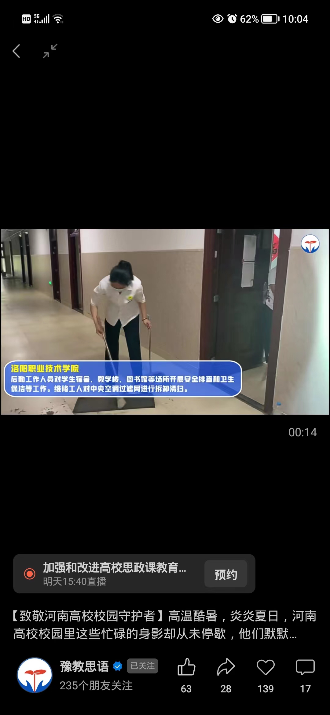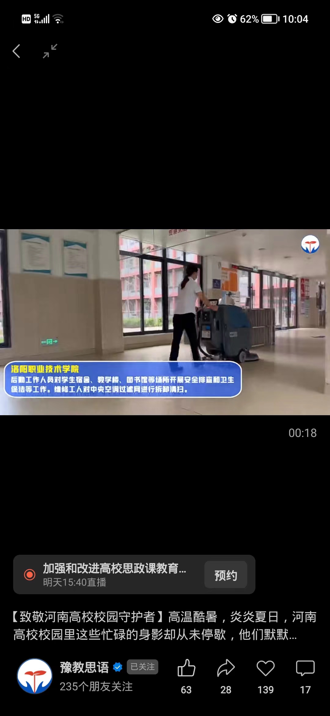 2022年8月19日。豫教思语视频号发布视频致敬河南高校校园守护者,其中有我校工作人员。报道原视频如下: