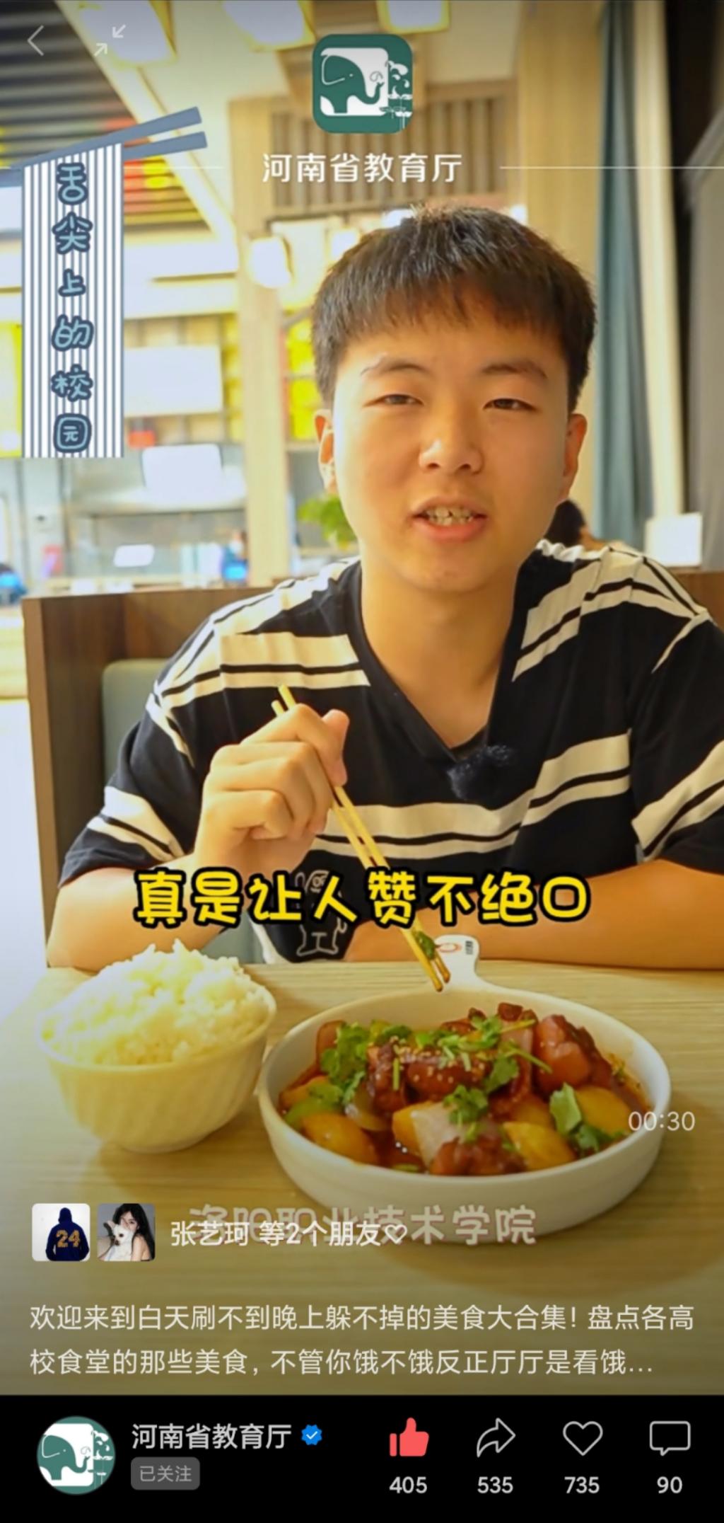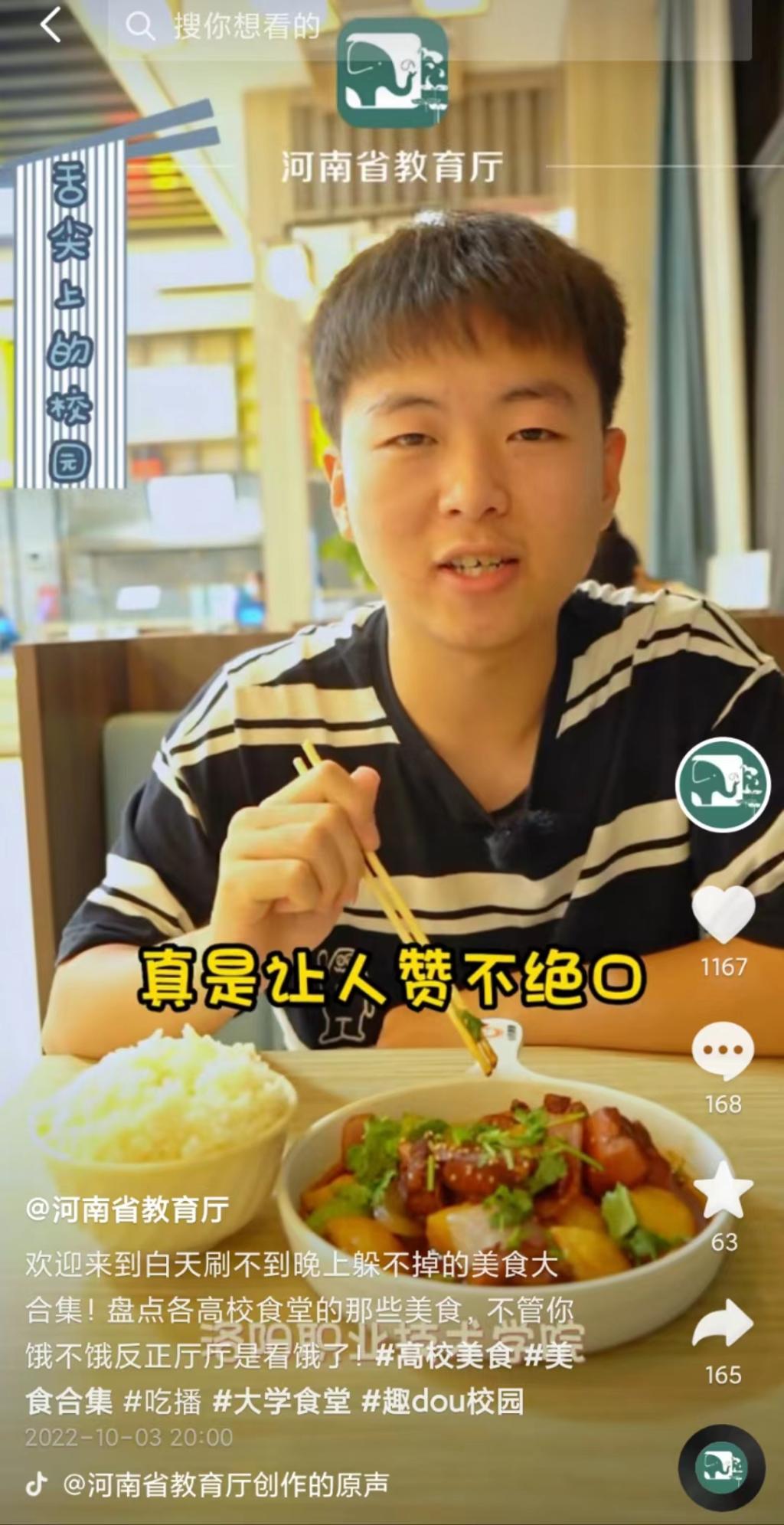 河南省教育厅抖音号、视频号:欢迎来到白天刷不到晚上躲不掉的美食大合集!盘点各高校食堂的那些美食,不管你饿不饿反正厅厅是看饿了!