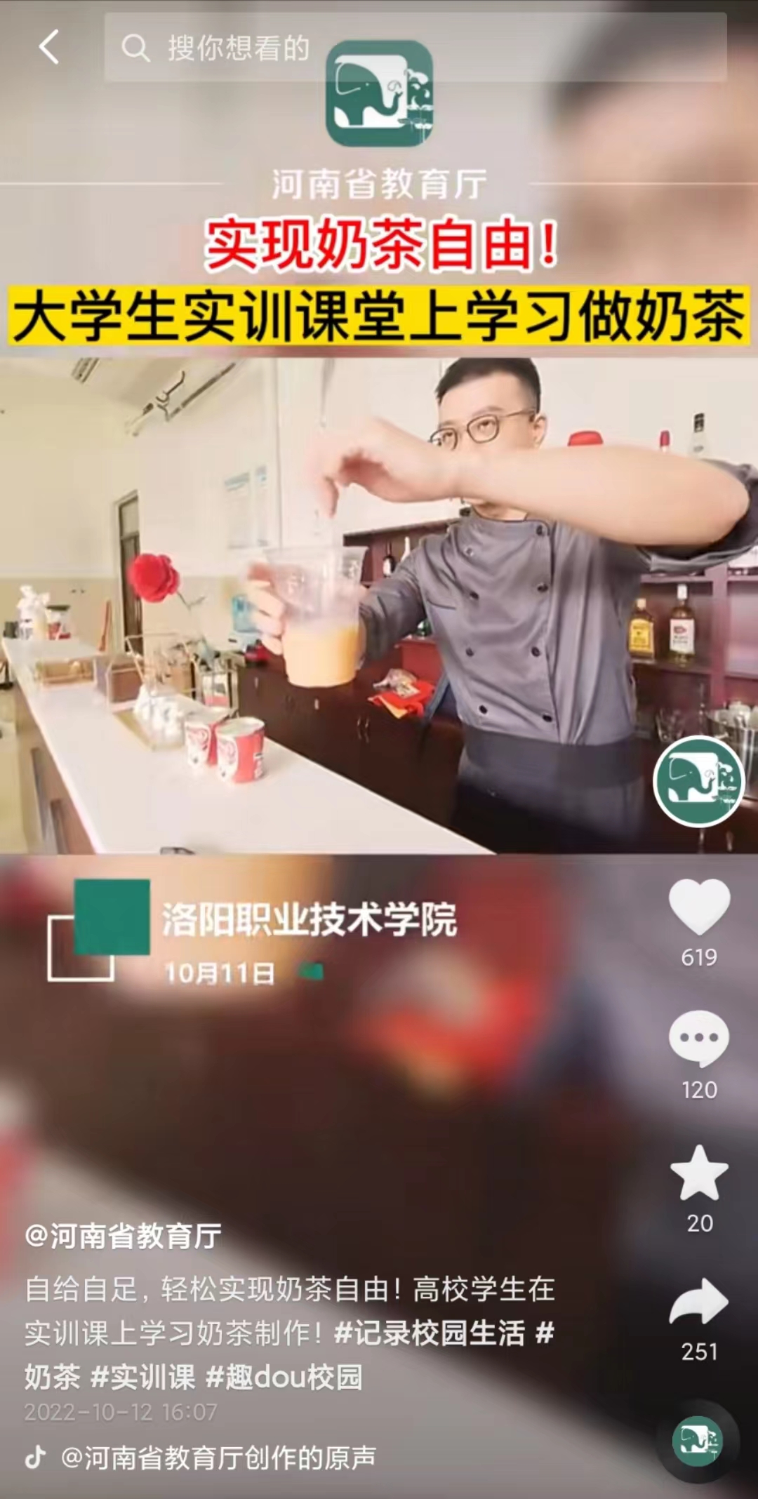 编者按:2022年10月12日,河南省教育厅抖音号、视频号发布我校学生在实训课上学习奶茶制作。原视频如下: