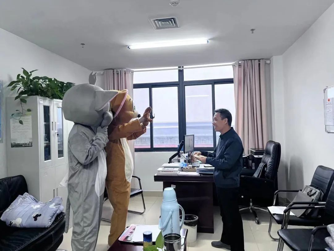 “太惊喜了!我正在改卷子呢,一抬头看见两个毛茸茸的‘小动物’,哈哈,抱起来真是暖暖的,感觉思绪一下被放飞了,太治愈了!”刚刚被“熊本熊”拥抱的老师开心地说。
