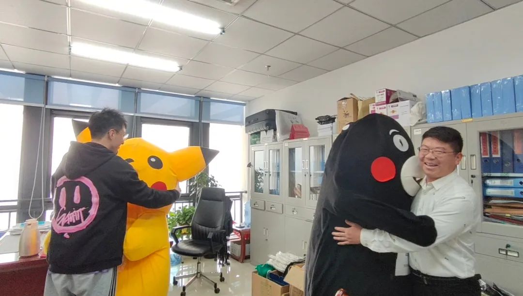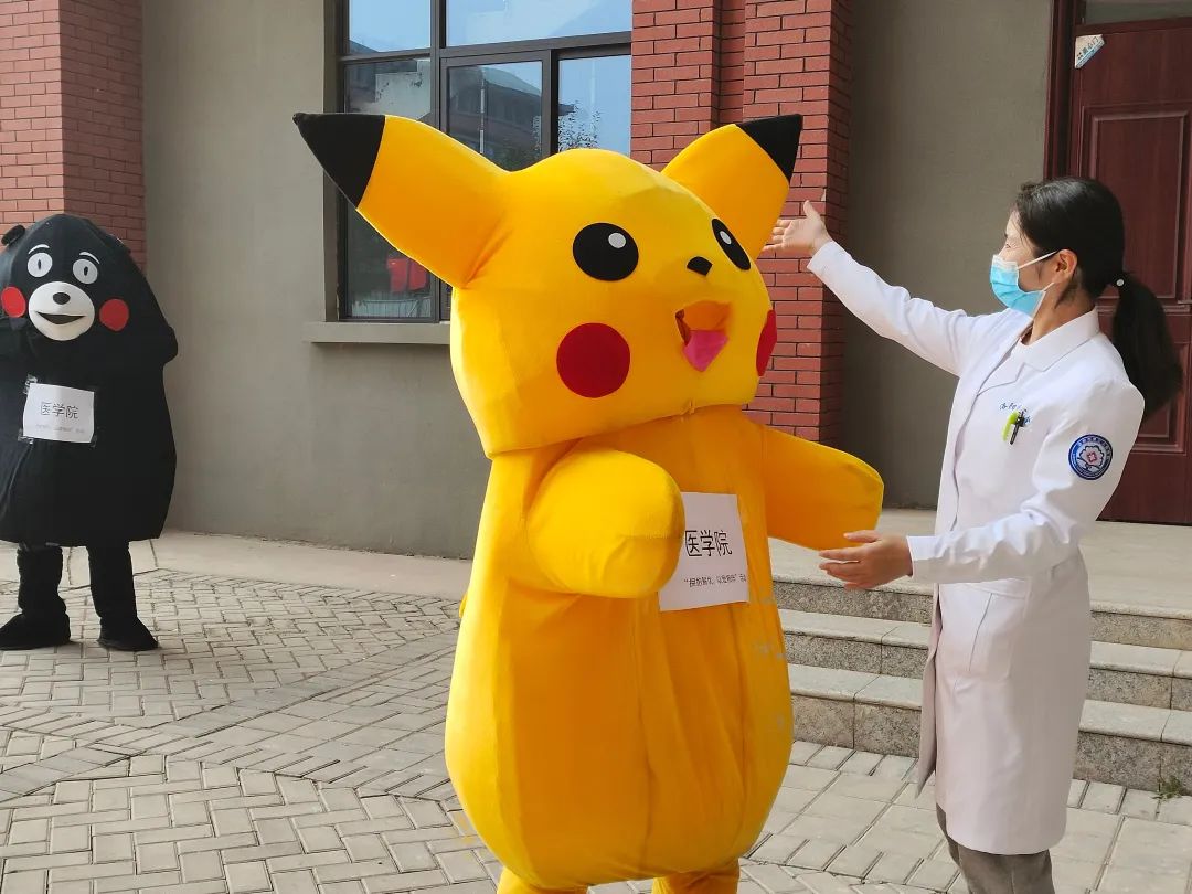 “杨老师,您辛苦啦!快来拥抱一下吧!”近日,在洛阳职业技术学院里,有四个身穿“熊本熊”和“皮卡丘”等毛绒衣服的卡通人偶,正在为坚守在岗位上的老师们送去“爱的抱抱”。它们看起来又大又圆,摸上去手感毛茸茸的,十分可爱。