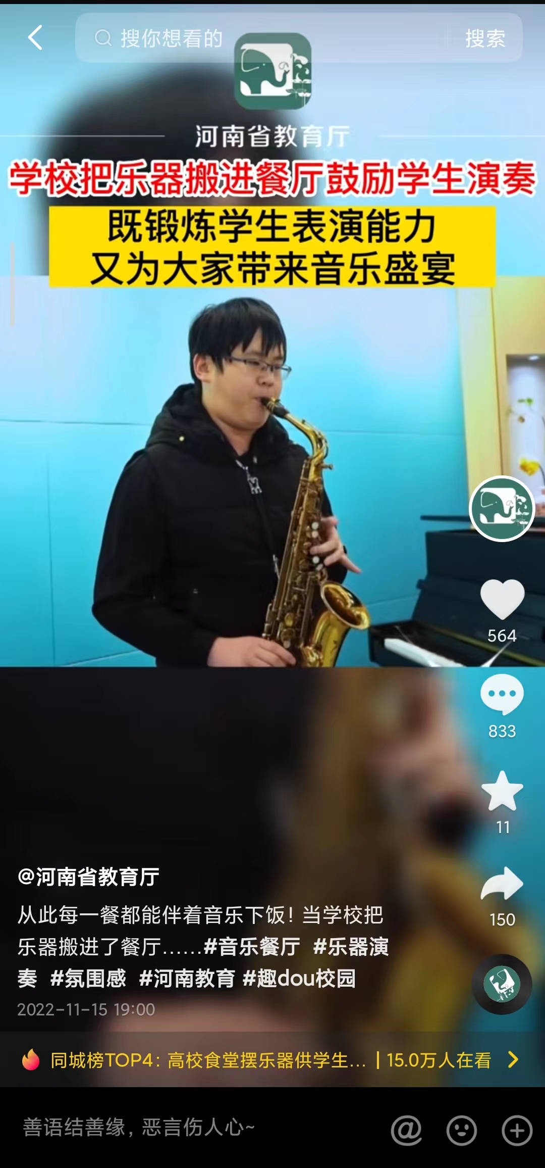 编者按:2022年11月15日,河南省教育厅抖音号、视频号报道当我校把乐器搬进了餐厅……报道原视频及相关链接如下: