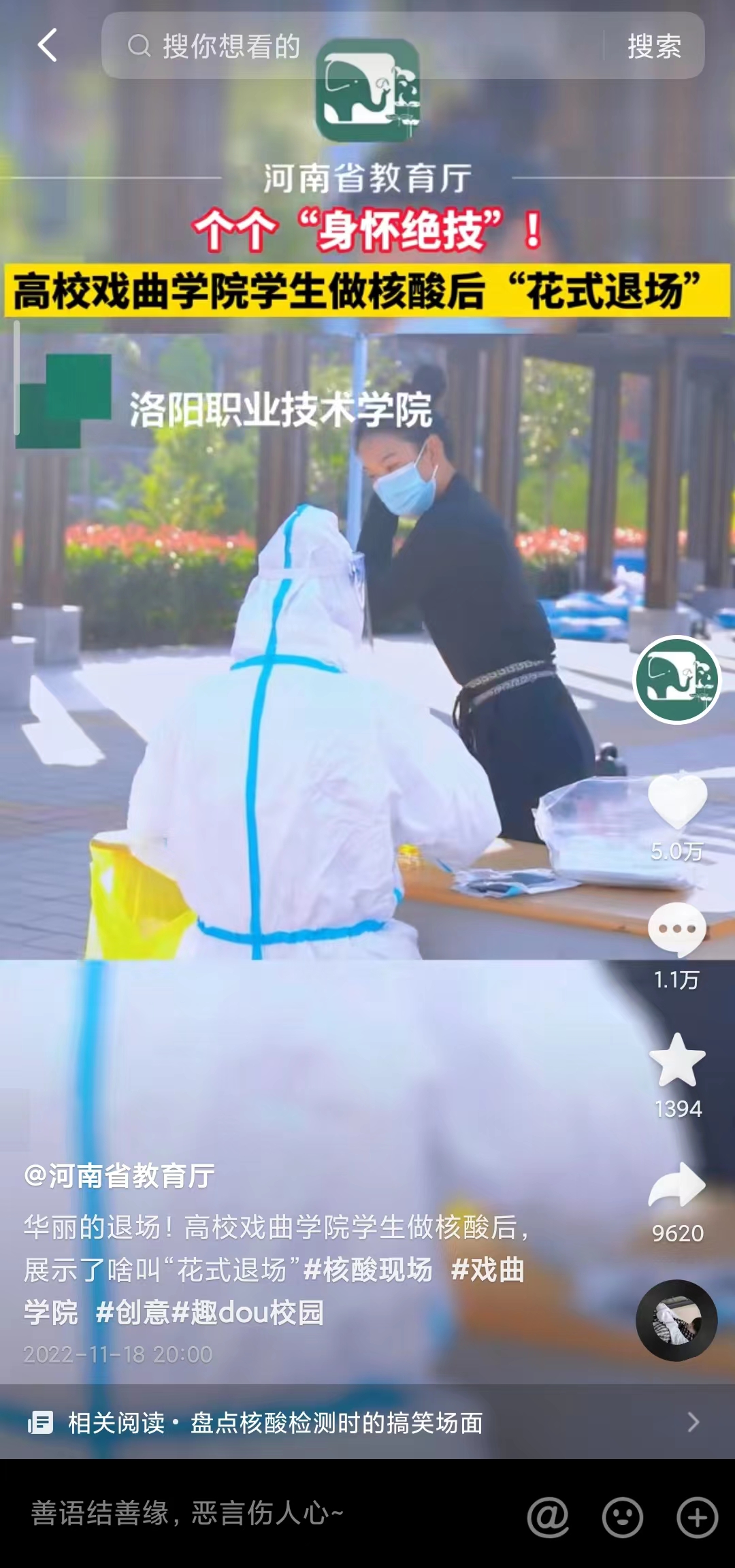 编者按:2022年11月18日,河南省教育厅抖音号、视频号报道我校戏曲学院学生做核酸后,展示了啥叫“花式退场”。报道原文及相关链接如下: