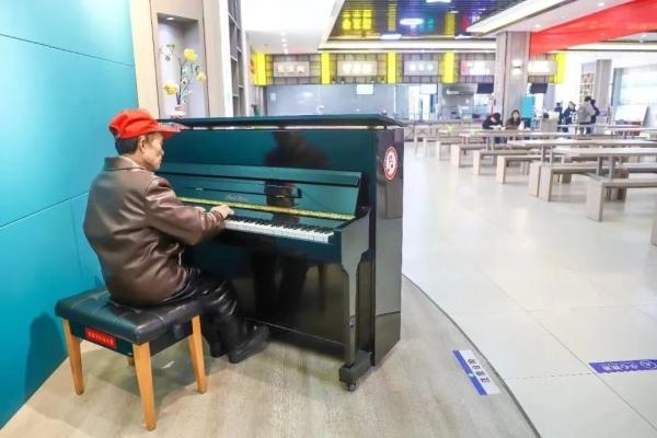 这天中午一点多,潘新芳结束了自己的工作,他坐在钢琴旁熟练地弹奏了一曲《东方红》,尽管此时伊滨校区2号餐厅内已经不再熙熙攘攘,但是仍然会有学生被悠扬的钢琴声吸引,驻足聆听。