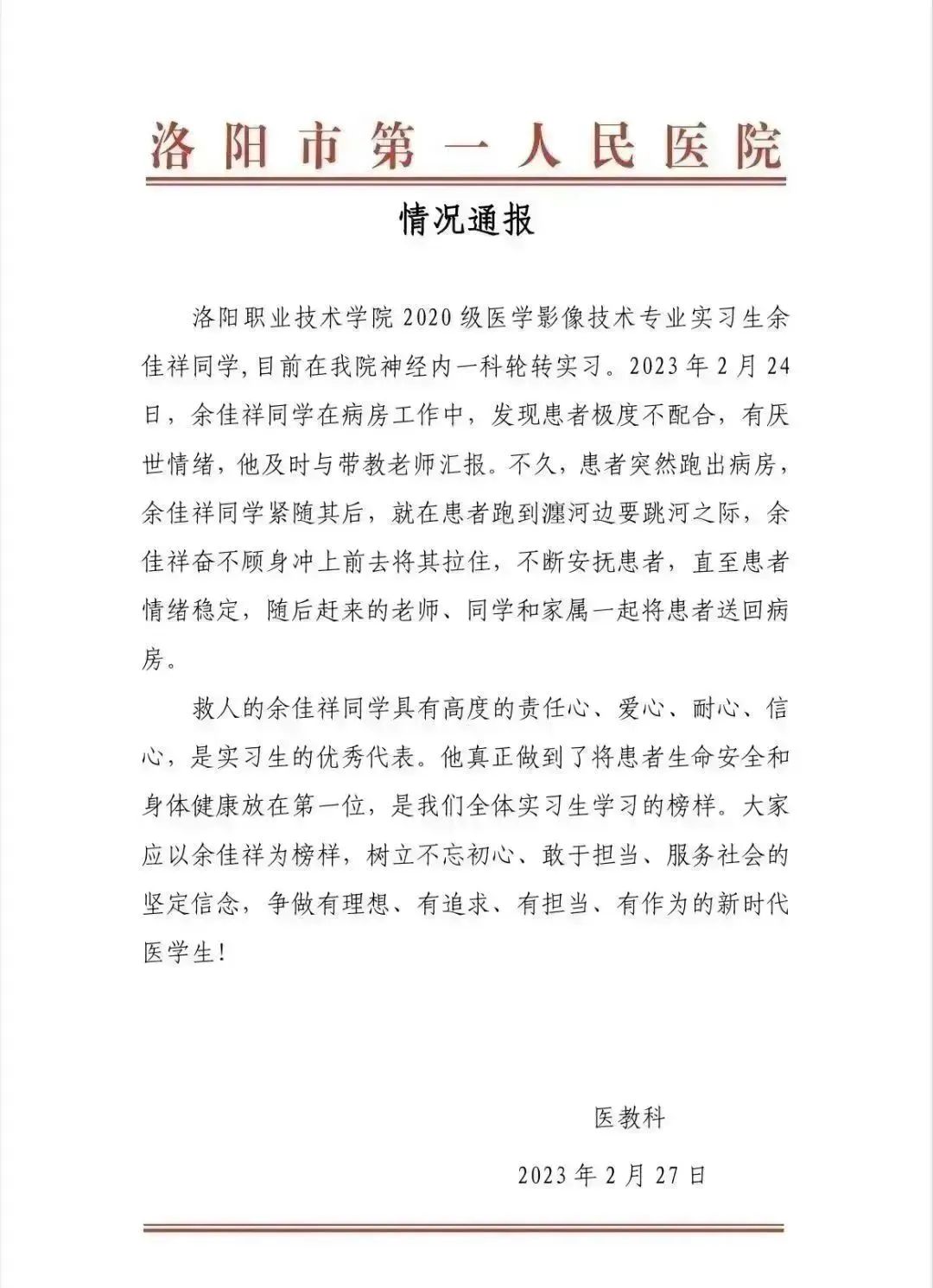 洛阳市第一人民医院的情况通报里这样写道:“救人的余佳祥具有高度的责任心、爱心、耐心、信心,是实习生的优秀代表。他真正做到了将患者生命安全和身体健康放在第一位。”