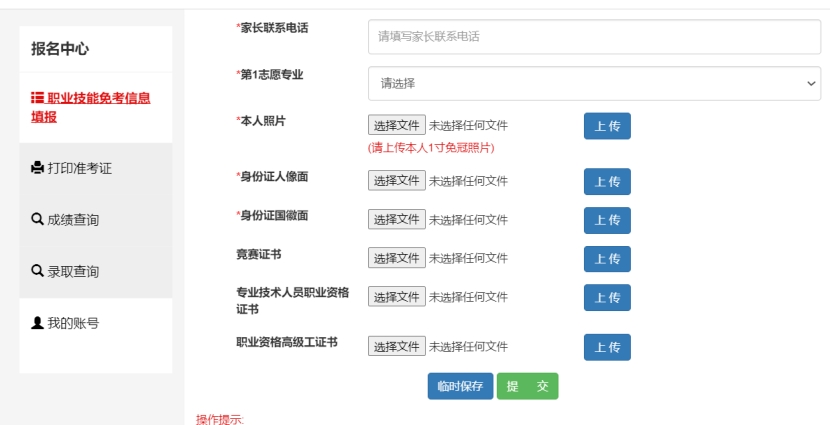 4.考生点击“职业技能免考信息填报”,完成基本信息填报和证明资料提交。(照片上传需先点击“选择文件”选择相应文件后,然后点击上传)