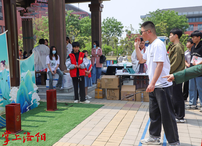 19日,洛阳职业技术学院餐厅前广场上热闹非凡。学生们身着汉服在书市挑选书籍,现场体验投壶、手绘牡丹团扇等古色古韵的游戏。