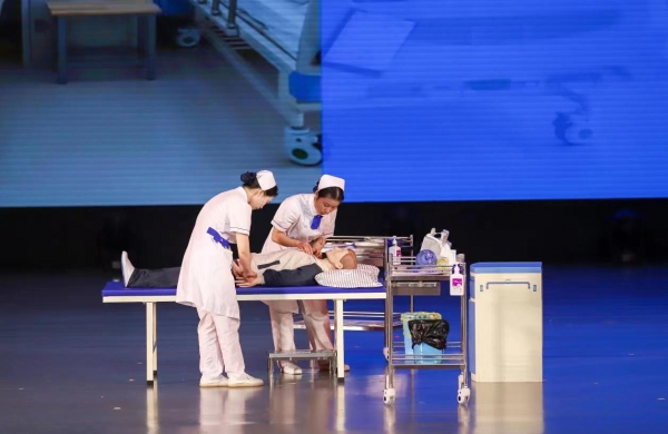 活动现场,护理与康养学院学生进行了双人心肺复苏术、老年人跌倒的预防及应急处理、产前运动指导等技能竞赛项目展示和护士礼仪表演,并通过舞蹈、歌曲、话剧精彩的文艺演出表达对护理人员的崇高敬意。