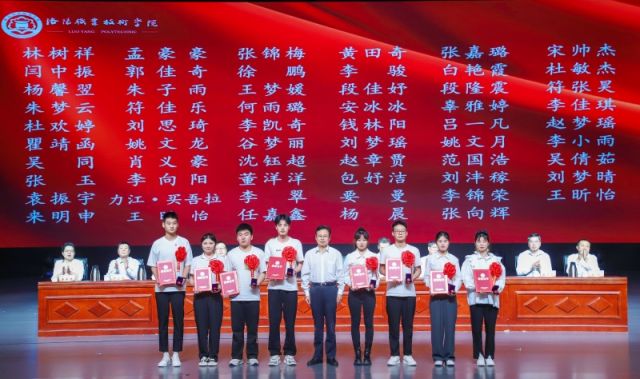 党委书记朱美荣为省级优秀毕业生代表颁发荣誉证书,赠送毕业纪念胸章。全体校领导为毕业生代表颁发毕业证书,为国家学生体质健康标准优秀等级学生代表颁发证书,并赠送毕业纪念胸章。
