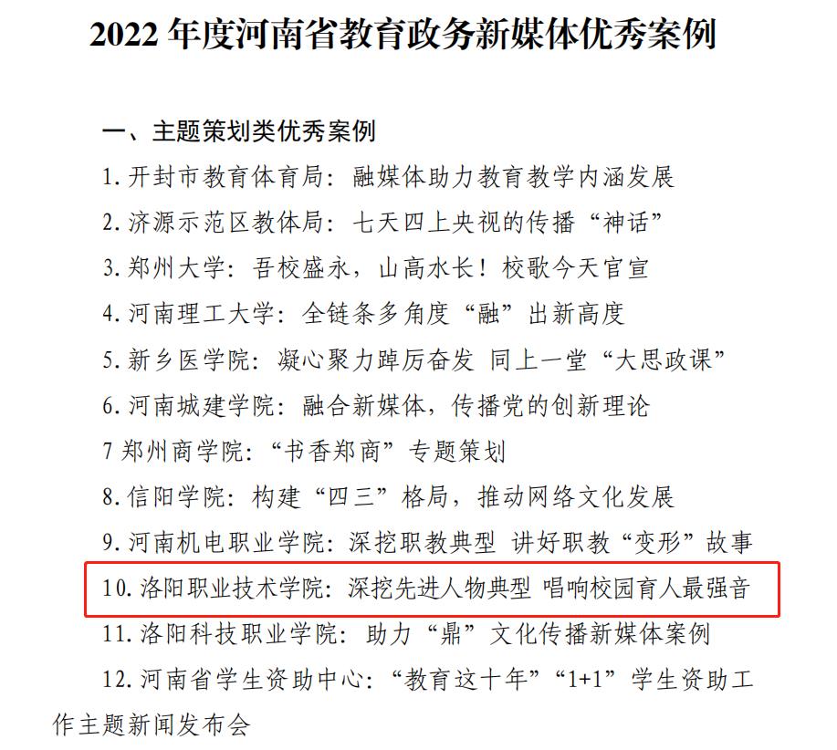 近年来,我校宣传工作始终坚持正确的政治方向,自觉承担起举旗帜、聚民心、育新人、兴文化、展形象的使命任务,紧紧围绕学校“双高校”建设等中心工作,坚持守正创新,服务学校大局,讲好洛职故事,展现校园风采,塑造良好育人形象。在全校师生的共同努力下,在各单位、各二级学院的大力支持下,党委宣传统战部指导融媒体中心和全校宣传员队伍,在学校各新媒体平台上创作出一大批师生爱听爱看、产生共鸣的新闻作品,切实提高我校宣传工作的传播力、引导力、影响力、公信力。