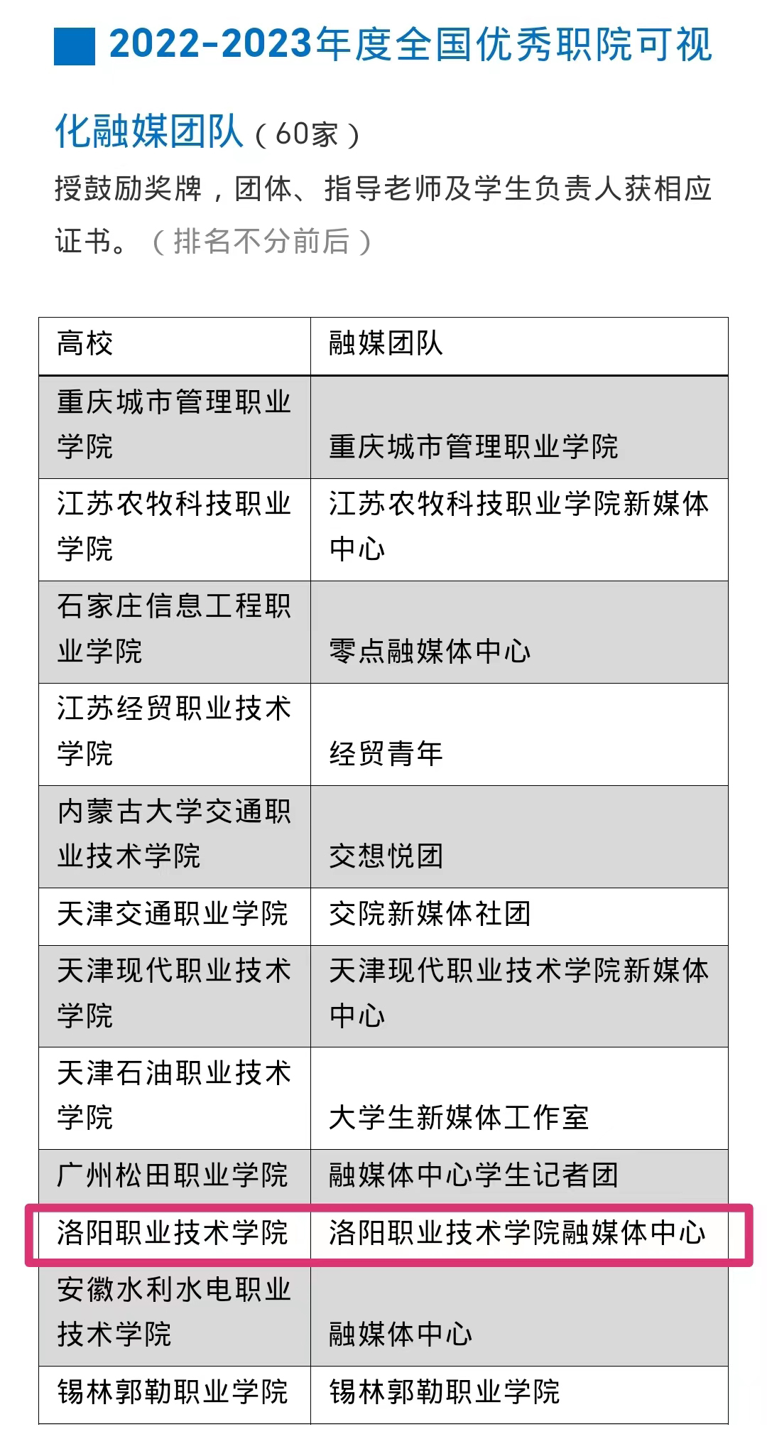 8月2日,中国青年报官方微信公众号公布了2022-2023年度中国大学官微百强名单、2022-2023年度全国高校可视化融媒团队名单。继入选2021-2022年度全国高职高专百强名单后,洛阳职业技术学院官方微信公众号再度跻身2022-2023年度全国高职高专官微百强名单。洛阳职业技术学院融媒体中心荣获2022-2023年度全国优秀职院可视化融媒团队。