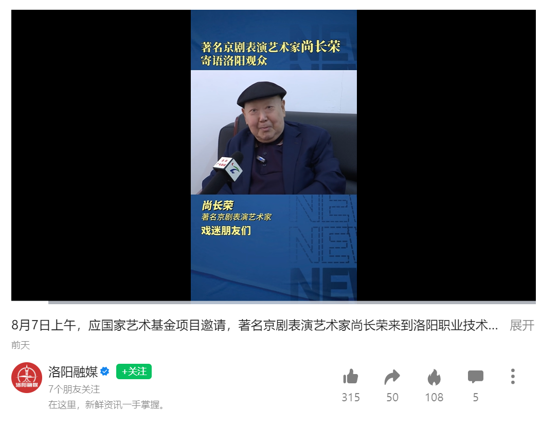 洛阳融媒微信视频号:著名京剧表演艺术家尚长荣寄语洛阳观众