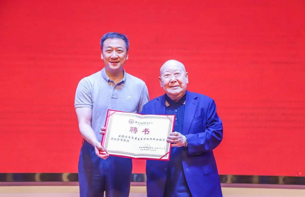 赵健为尚长荣颁发洛阳职业技术学院“荣誉教授”聘书。
